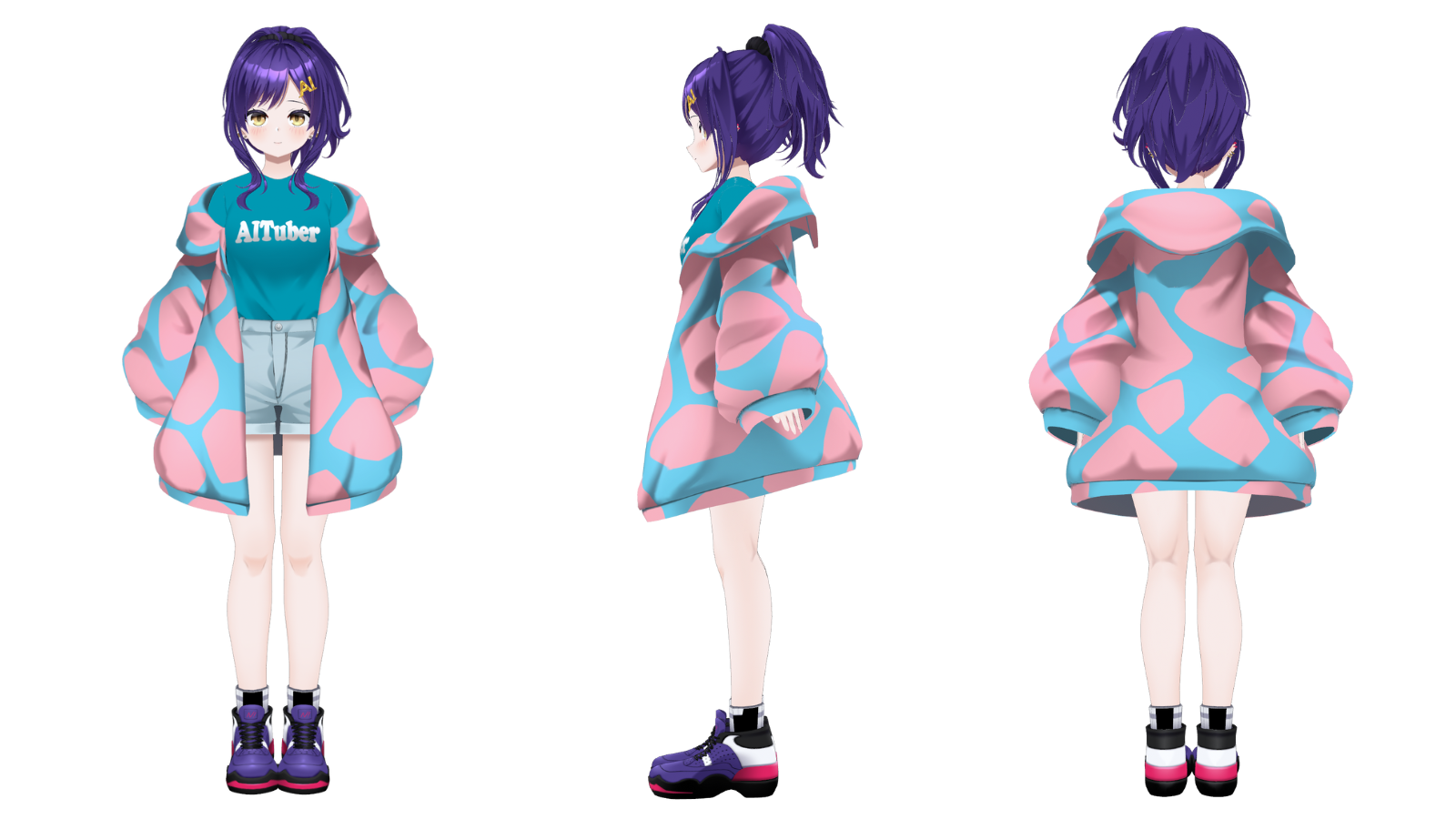 この画像のキャラがダンスを踊っている。 女の子の特徴を以下に示す。 - 金色のヘアピンは「AI」という文字の形をしています。 - 黒いシュシュを使って高めの位置でポニーテールをまとめています。 - Tシャツの胸の部分には、「AITuber」という文字が書かれています。